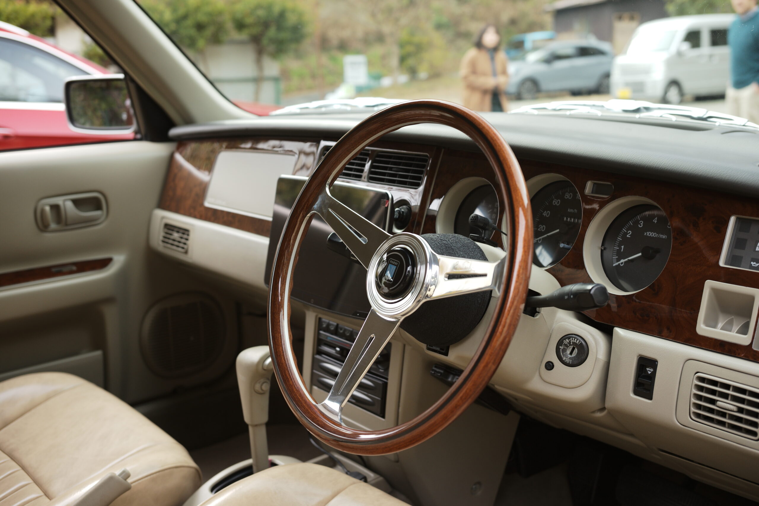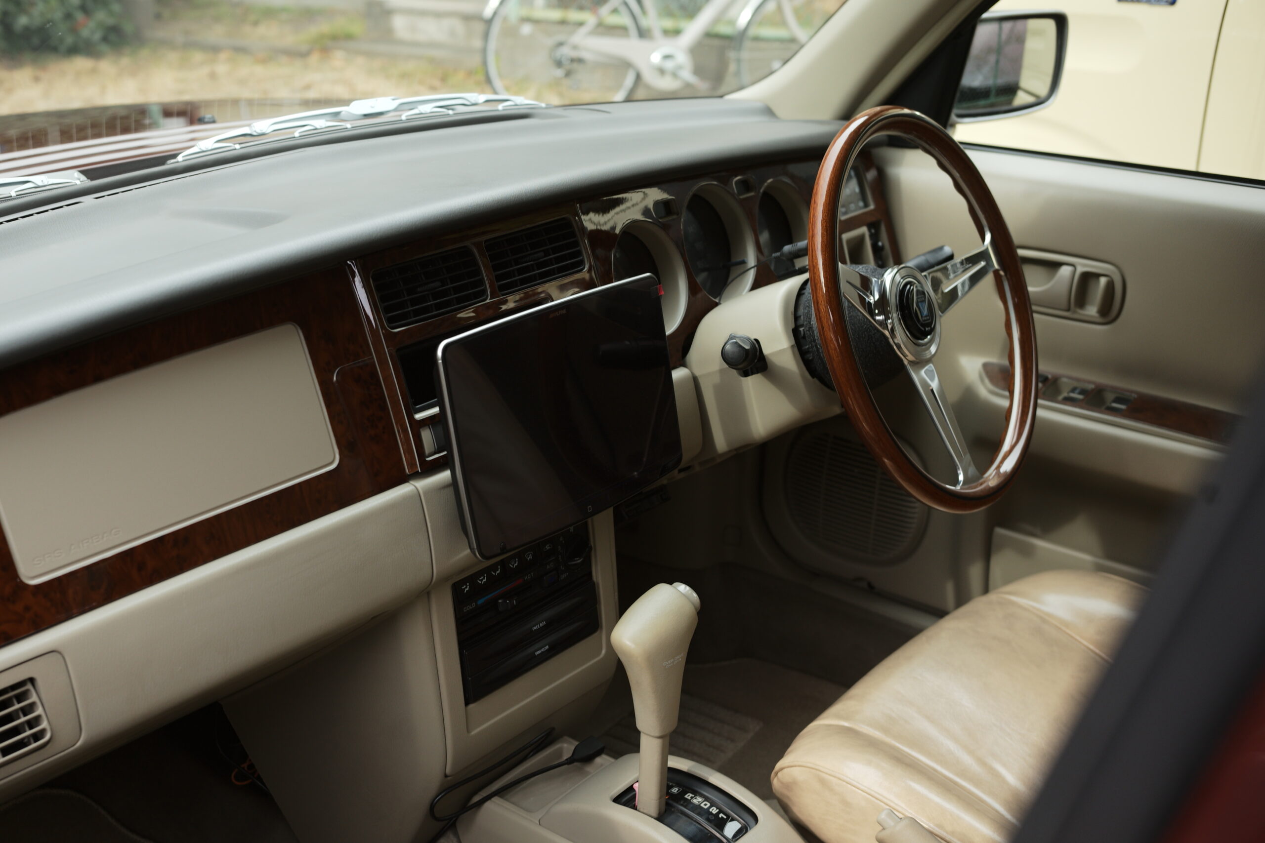 外装の品の良いマルーンカラーにあわせ、名作クラシックウッドハンドルに、ウッドパネルを装い、シートはアンティークレザーにて張替えをおこなった。イギリス王室御用達のような雰囲気がとてもCOOL.
